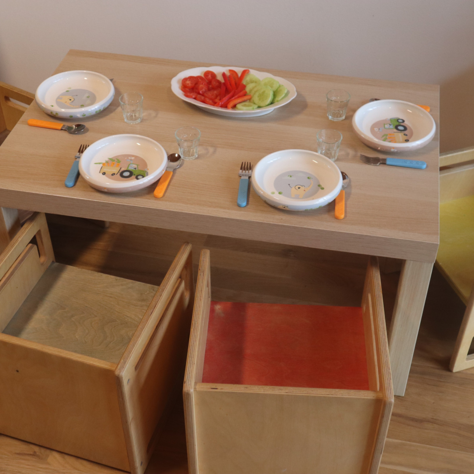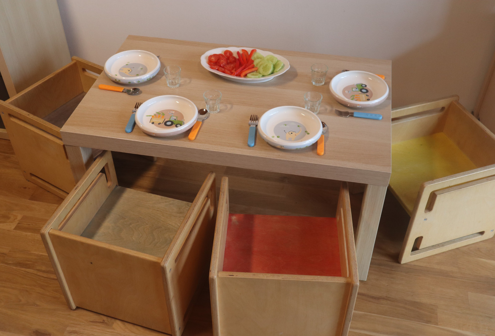 Im Erdgeschoss befindet sich unser großes Wohnzimmer mit einer eigenen Spielecke für die Tageskinder. Direkt anliegend befindet sich die offene Küche, so dass ich die Kinder beim Vorbereiten des Frühstückes und Mittagsessens immer im Blick habe. So haben die Kinder auch immer die Möglichkeit zu entscheiden, ob sie bei der Zubereitung mithelfen möchten.